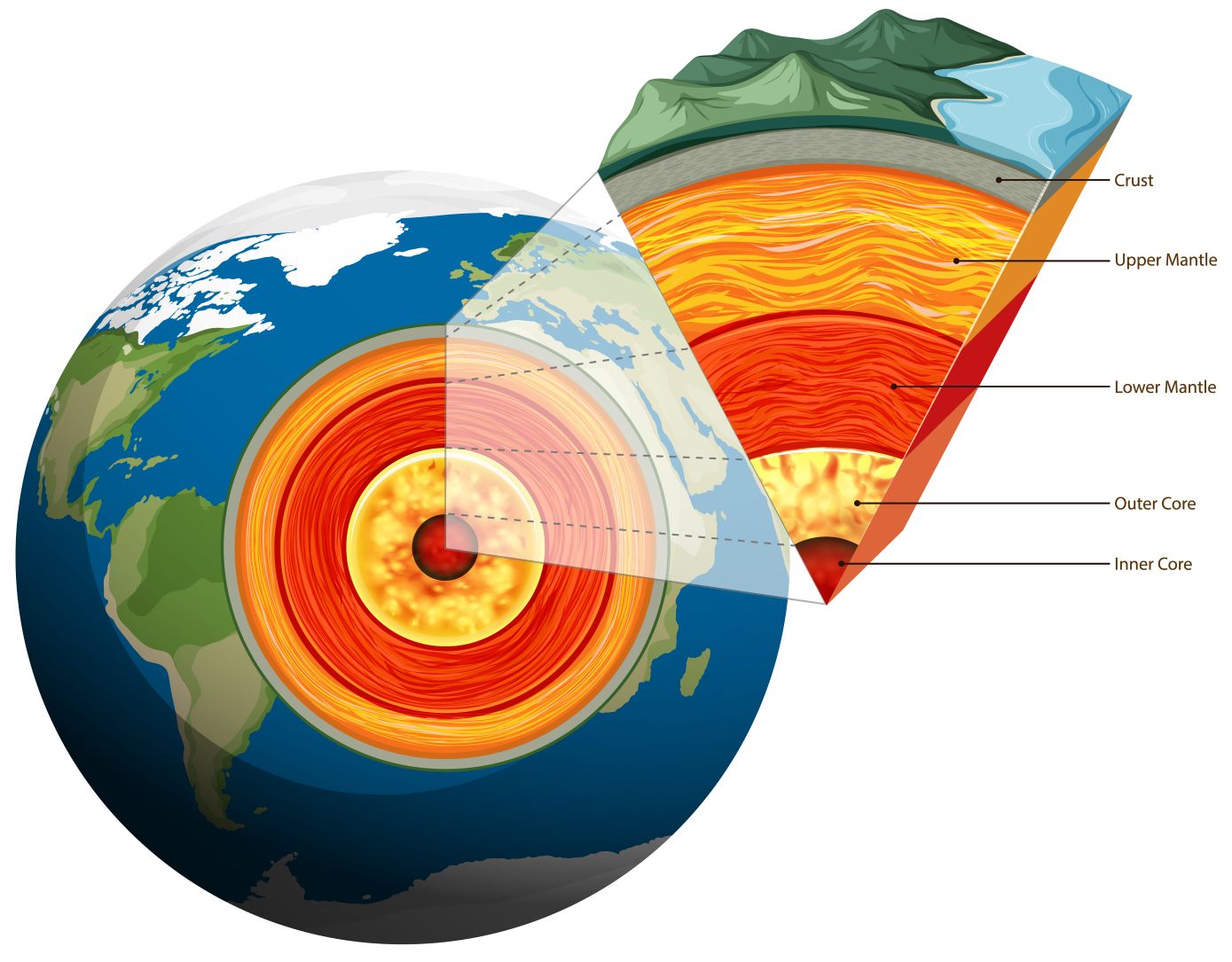 Like an egg, Earth has several layers. The continents and ocean floor make up Earth’s outermost layer, called the crust. The crust is Earth’s thinnest and coolest layer. The layer below the crust is the mantle. Part of the mantle is solid rock. Part is nearly melted rock that is soft and flows. It is a lot like putty. At the center of Earth is the core. The core is the deepest and hottest layer of Earth. The outer core is melted rock. The inner core is solid rock.