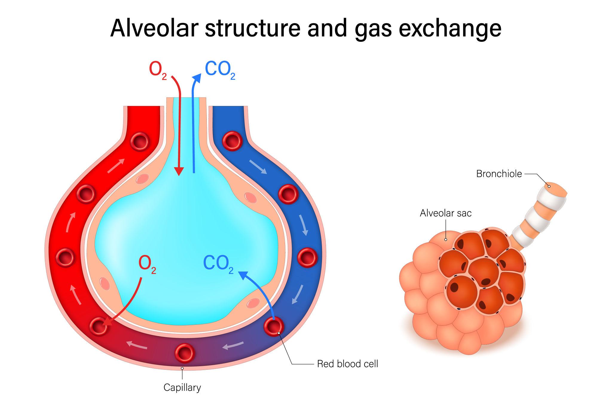 In the lungs alveoli (singular – alveolus) there is a higher concentration of oxygen compared to the concentration of oxygen in the blood. However, there is a lower concentration of carbon dioxide in the alveoli than the concentration of carbon dioxide in the blood. This concentration gradient results in the movement of oxygen from the alveoli air into the capillary network where it attaches to hemoglobin. Carbon dioxide moves from the blood across the alveoli and into the alveoli.