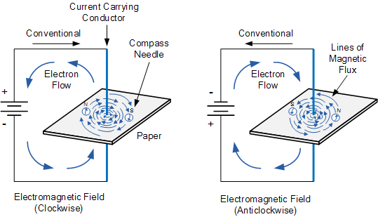 The direction of the magnetic fields around a conductor can be determined by using the right-hand rule. The right-hand rule is used for conventional current and the movement of positive charge. On the other hand (literally) the left-hand rule is used for electron current