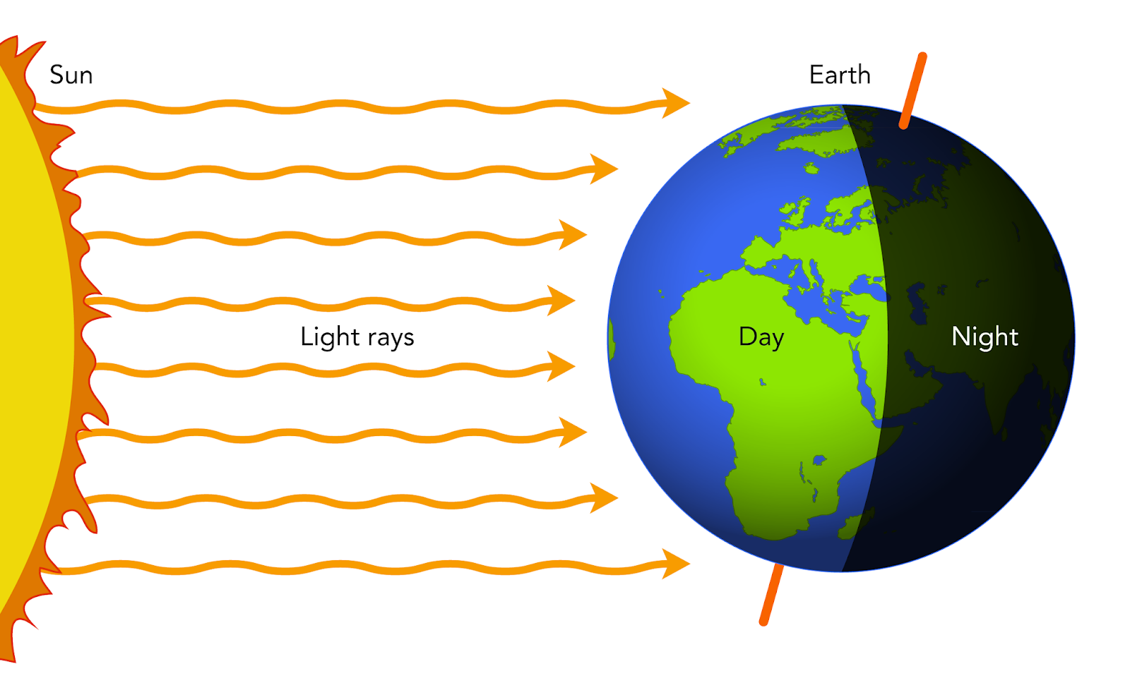 Earth’s rotation causes day and night. When one side of Earth faces the Sun, it is day. At the same time, it is night on the other side of Earth.
