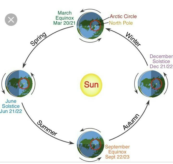 As the earth orbits around the sun, the part of Earth that tilts toward the Sun is warmer. The part of Earth that tilts away from the Sun is colder.