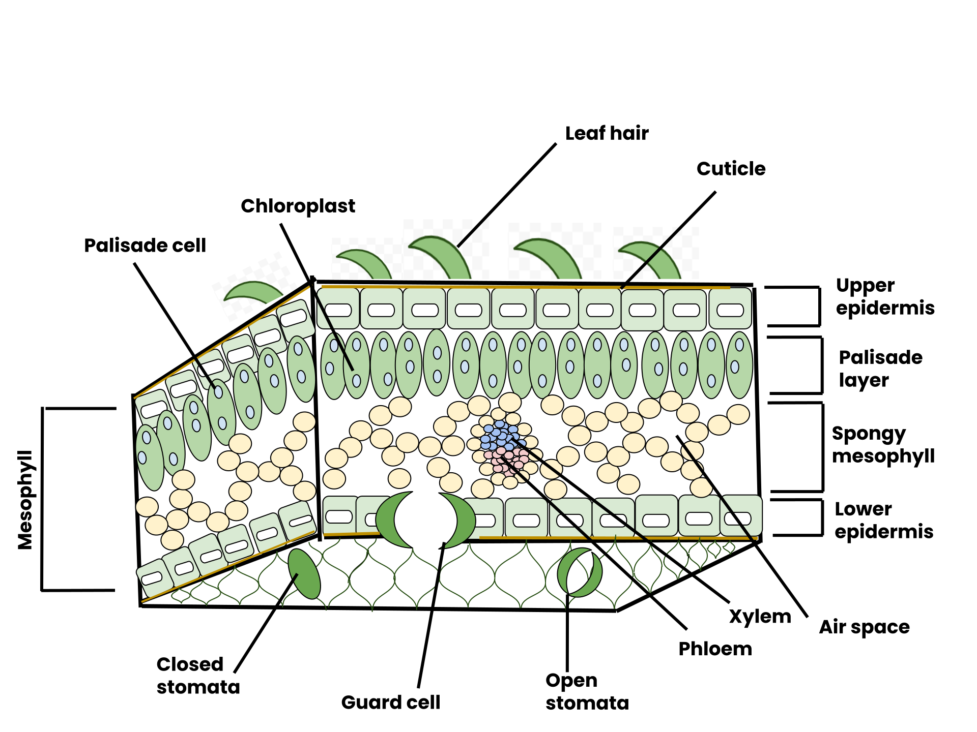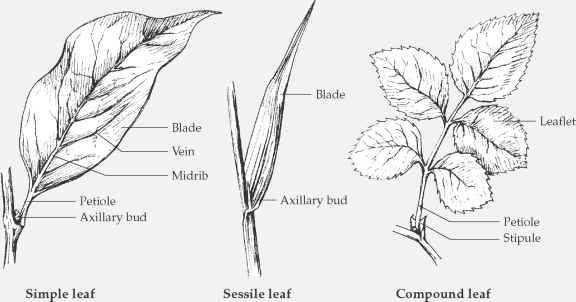 Leaves come in many shapes and sizes ranging from broad to narrow elongated leaves, and others are shaped like needles. Leaves may also be simple or compound leaves. The outermost layer of a leaf is the epidermis. It is covered by a waxy coating called the cuticle. On plants that stay green year-round, such as pine trees, the cuticle prevents the leaves or needles from losing too much water, especially during cold or dry weather.