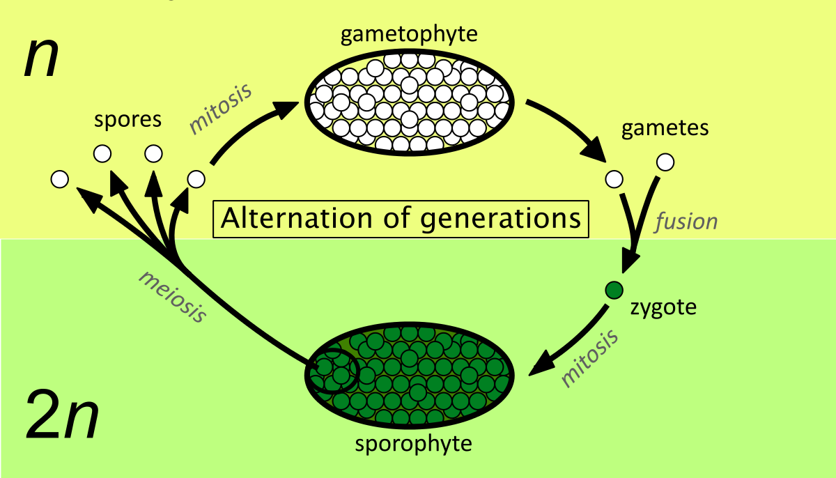 In seedless plants such as mosses, their life cycle has two separate stages, one is asexual where the plant producers spores. The other stage is sexual reproduction during which the plant needs both male and female cells so as to reproduce. The process of going from sexual to asexual reproduction is called alternation of generations (also known as metagenesis or heterogenesis.