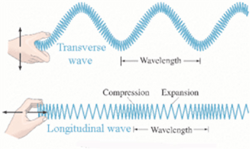 Using a long spring fixed on one end and free on the other end to demonstrate these two types of waves. If you displace the spring sideways, the sideways oscillations set up a transverse wave. If you displace the spring on its longitudinal axis, making it longer and shorter repeatedly, the displacements that develop along the axis set up a longitudinal wave.