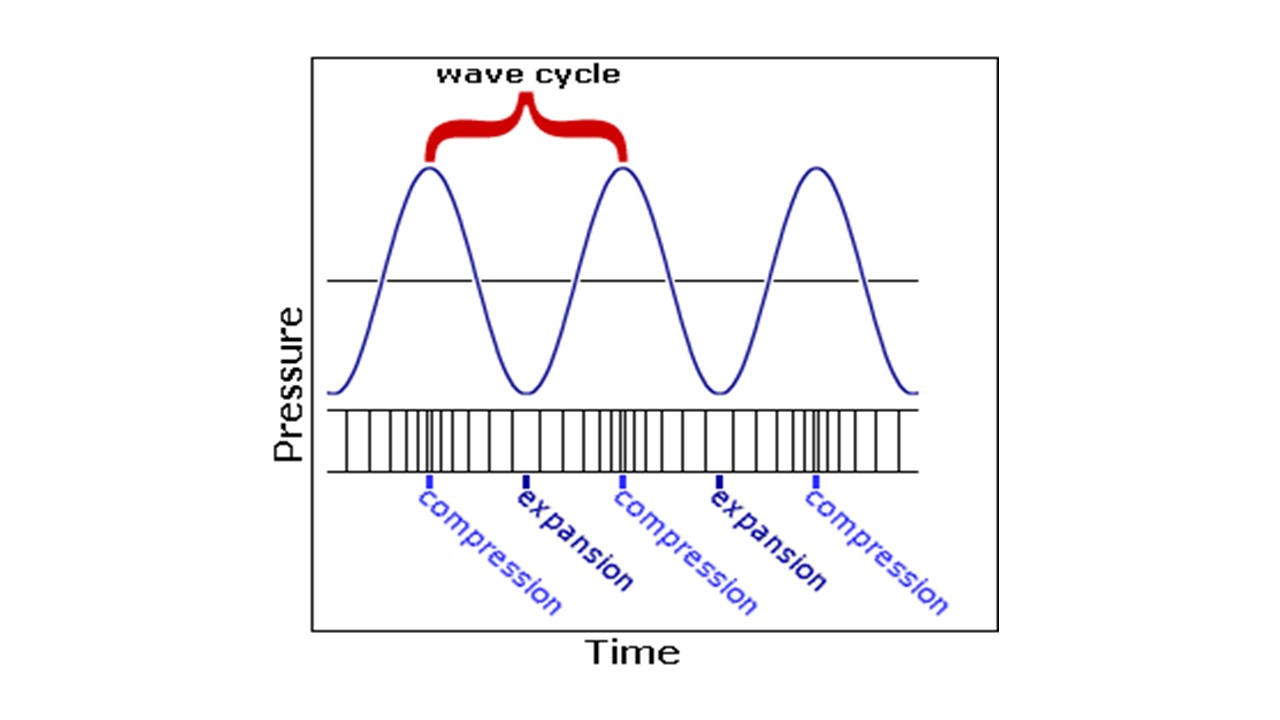 Sound is a longitudinal wave caused by a vibrating object. Peaks correspond to areas of high pressure and troughs correspond to areas of low pressure. Sound is a mechanical wave, it requires a medium to travel through, which explains why sound cannot be heard in a vacuum. Sound intensity refers to the loudness of sound and is determined by the amplitude of sound. The louder the sound the higher the amplitude. There is an inverse squared relationship between sound intensity and distance from the point-source. The pitch is determined by the frequency of the sound. High frequency sounds are high pitched and low frequency sounds are low pitched.